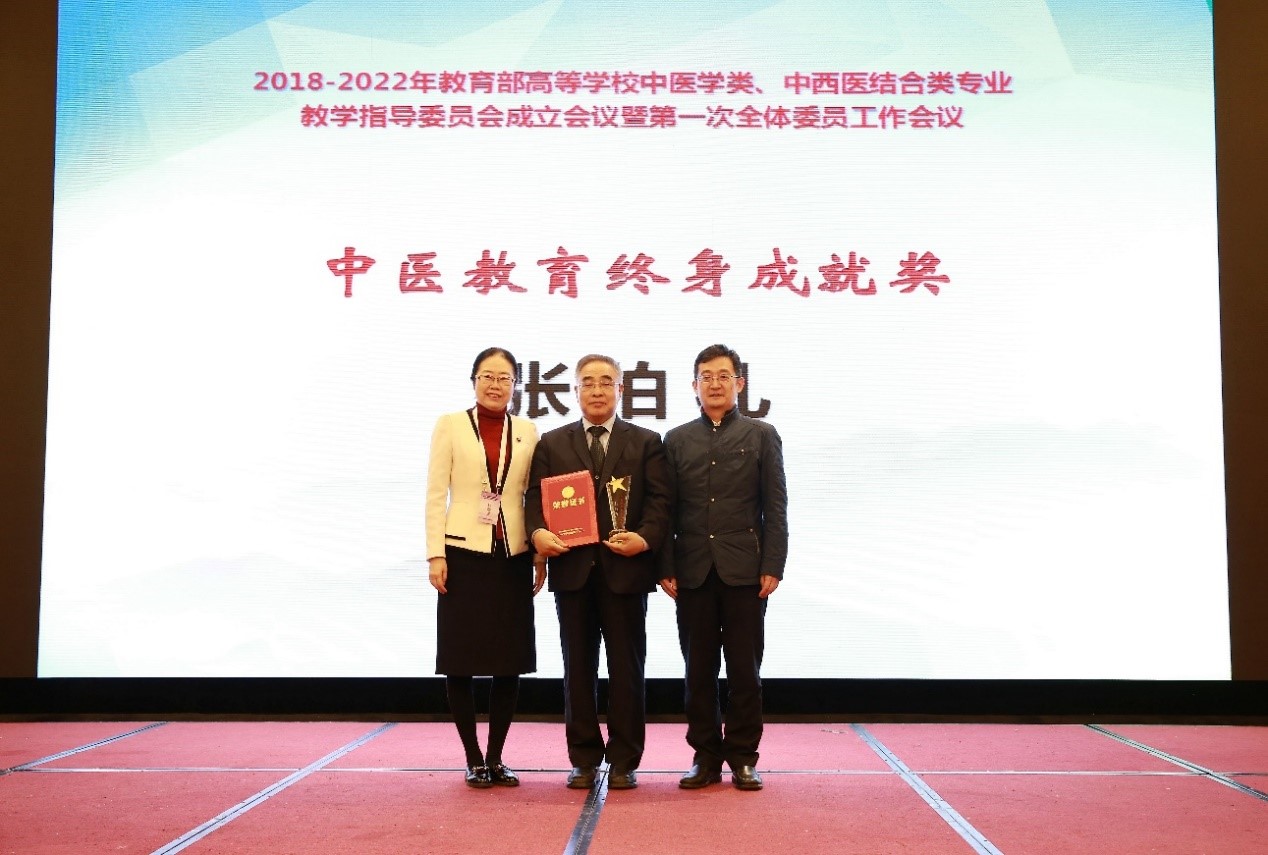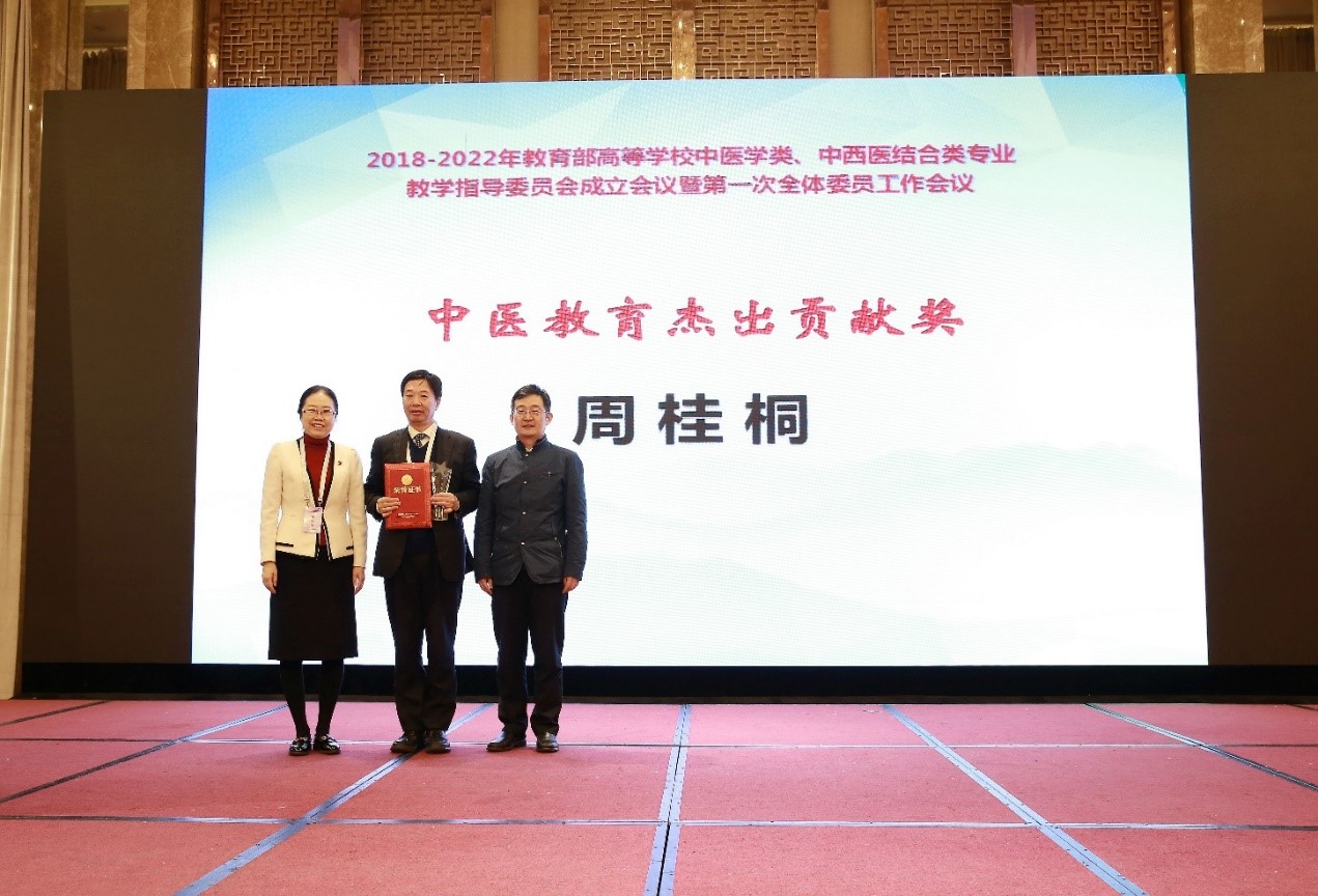 中医学类专业教学指导委员会谷晓红主任委员宣读了《关于授予张伯礼院士中医教育终身成就奖的决定》和《关于授予周桂桐教授中医教育杰出贡献奖的决定》,高斌处长和谷晓红主任委员共同为张伯礼院士和周桂桐校长颁奖,以表彰他们在中医教育中做出的突出贡献。